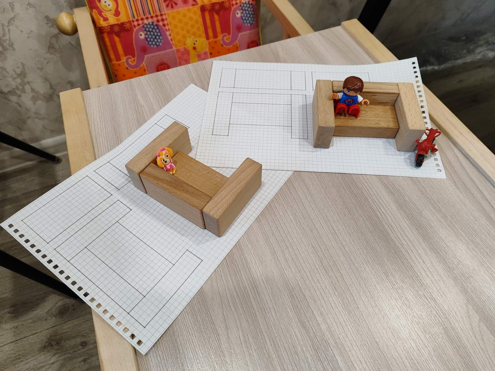 20:30 А после душа можно заняться нашим общим хобби — строительством из кирпичиков. Когда покупали первый набор кирпичей, не думали, что это так увлечёт. Однажды для очередной нашей постройки не хватило деталей, после чего было принято решение докупить ещё один комплект. В комплекте было пособие с заданиями, там рассказывалось, как научить ребёнка конструировать по чертежу. Правда чертежи в нём были мелкие, я начертила в натуральную величину и начала показывать их дочке. Спустя три месяца занятий, ей удалось понять, что второй чертёж — это поворот первого. Раньше она разрушала исходный и делала новый. После успешно выполненного задания она построила ещё пару сооружений, и мы прочитали захватывающую историю про динозавров.